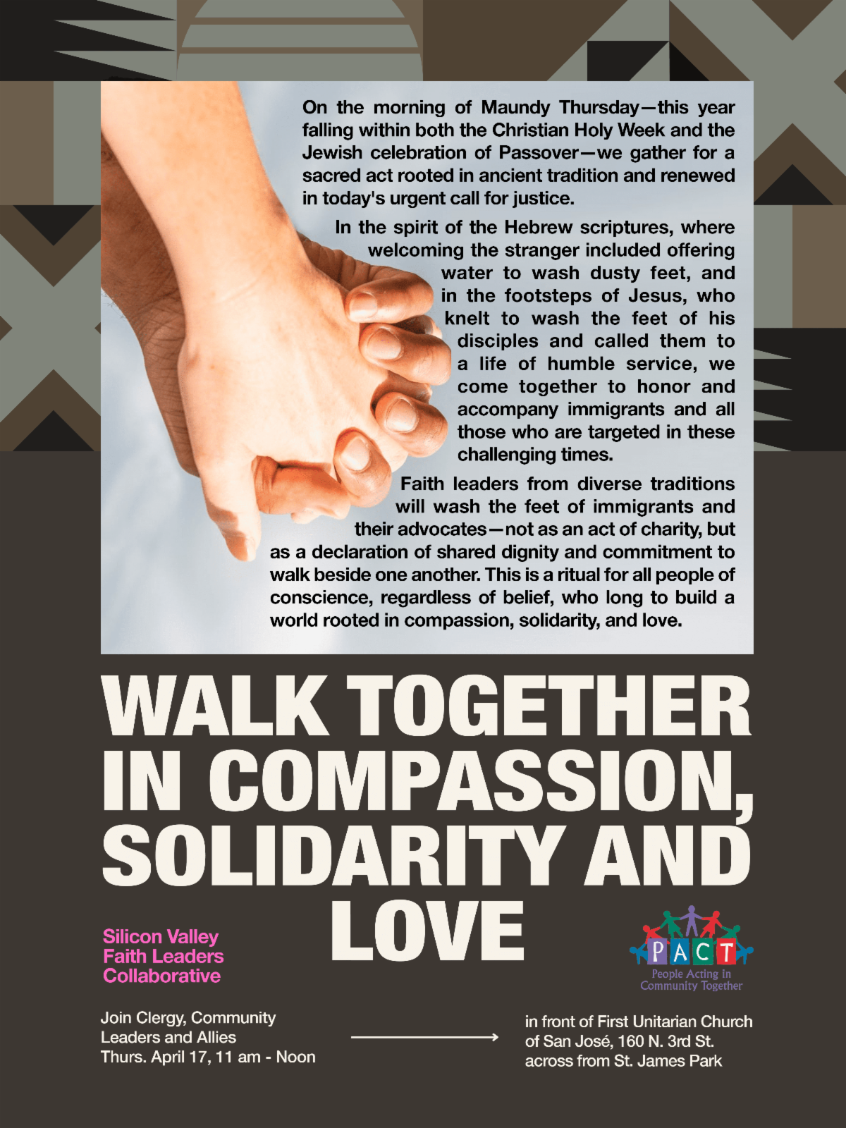 PACT San Jose Invites you to join clergy, community leaders and allies Thursday April 17, 11 am in front of First Unitarian Church 130 N. 3rd. St. San Jose. "Faith leaders from diverse traditions will wash the feet of immigrants...as a declaration of shared dignity and commitment to walk beside one another."