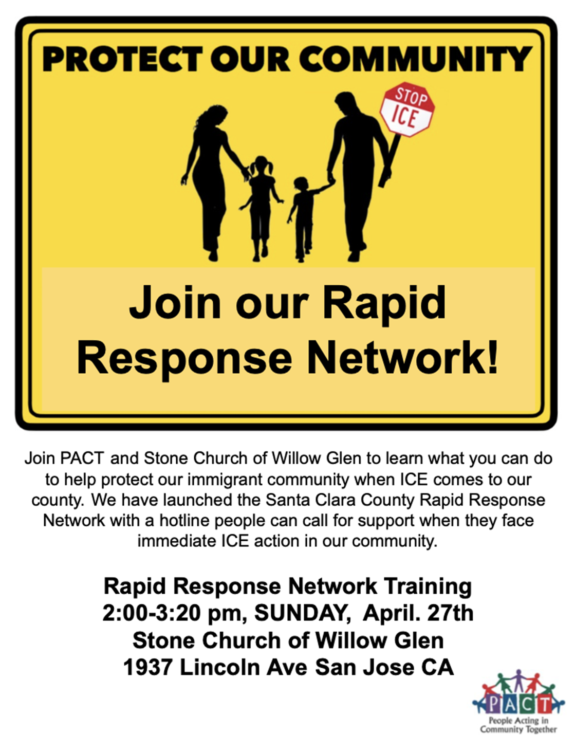 PACT will be presenting a Rapid Response Network Training at Stone Church on Sunday, April 27 from 2-3:30pm.