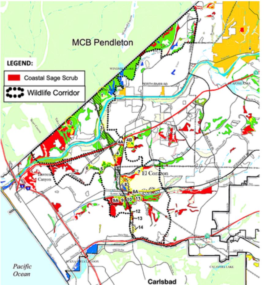 The discussion about a wildlife corridor has been going on for 30 years now. During 1995 and 1996, studies were completed and the Multiple Species Conservation Plan for north San Diego County (Oceanside, Carlsbad, Vista, San Marcos, Escondido, Ecinitas, Solana Beach) identified core area habitat and connecting wildlife corridor. Planning at that time suggested that remaining natural areas and open spaces in the City of Oceanside were critical to the conservation of some species, particularly the threatened coastal California gnatcatcher.