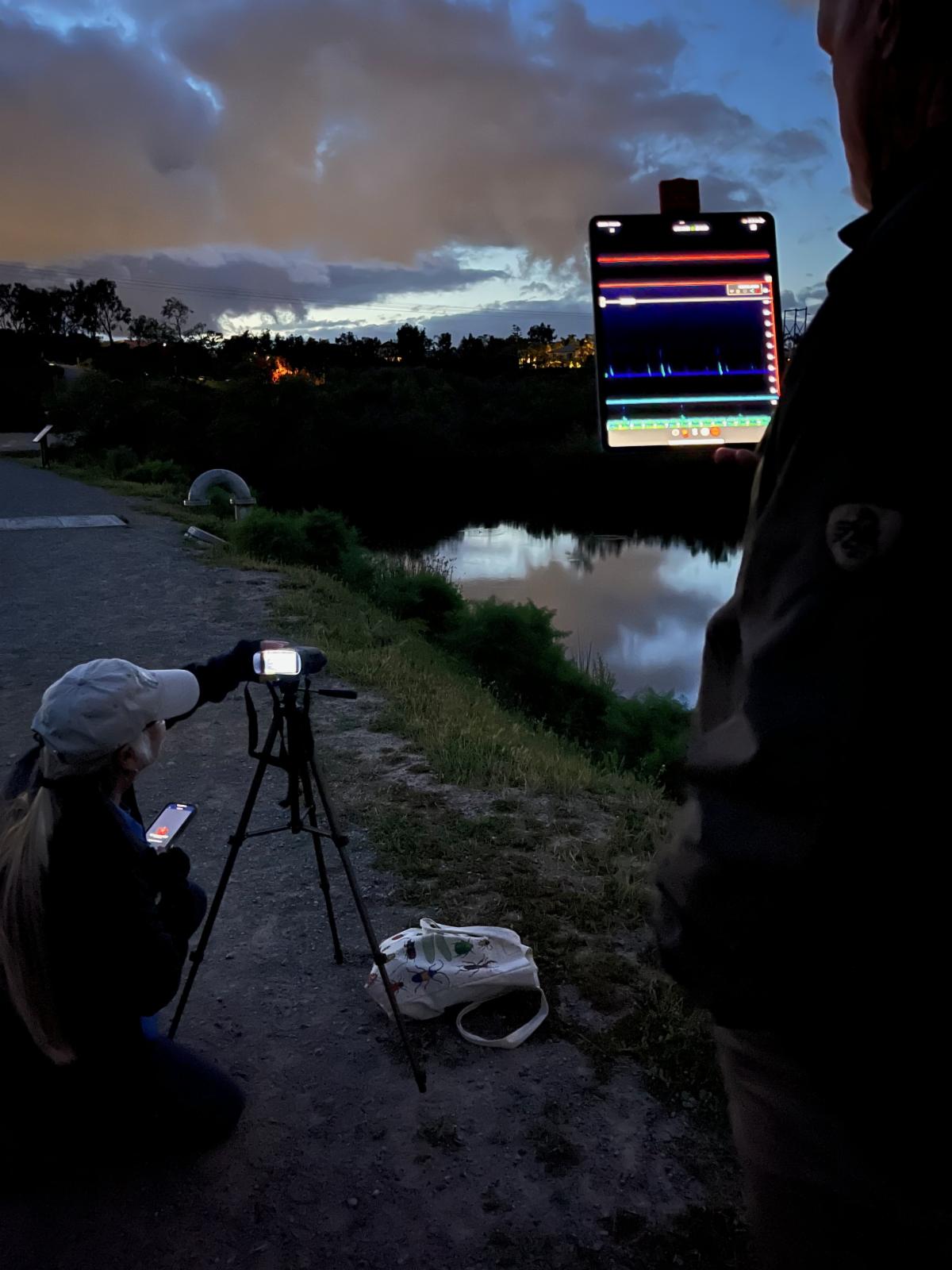 As sunset began on the chilly Friday, about two dozen people convened at the dam to wait for the bats to make their presence known as they arrived to feed on the insects. Many of the participants brought bat detectors (which convert a bat’s call into sounds audible by human ears) and also night vision scopes and cameras.