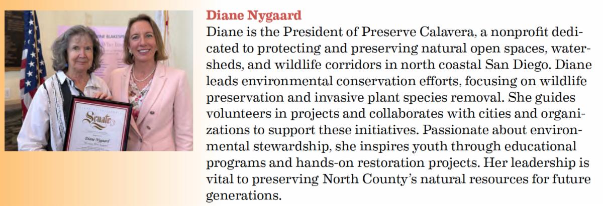 Senator Blakespear congratulated all the nominees during a reception in March for their outstanding work and thanked them for their leadership, service, and achievements. You can read Senator Blakespear's comments about Diane below.