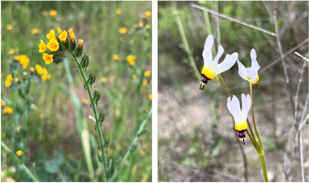 | | Walking along trails in our local preserves in springtime gives one the opportunity to delight in the variety of spring flowers. And along with the iconic California poppy, there are so many more flowers to enjoy such as the delicate fiddlehead and the shooting star shown below. | |