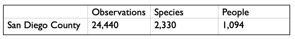 | | Cindy Meyers (volunteer bat advocate and community educator with the San Diego Humane Society) brought taxidermied bat specimens to allow attendees to get a close up look at our local bats. | | Volunteers by Lake Calavera with bat detectors (attached to smartphones and tablets) and night vision scopes. (Photos by E. Bartlett) | | | | | Here are the numbers for participation in the City Nature Challenge in our County: | | | Diane Nygaard Continues to Inspire All of Us to Do More | |