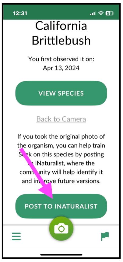 Along with helping to identify the plants and animals around you, iNaturalist can also use your observations for generating data for science and conservation. To include your observations for the scientific community at large, you can simply click the link that says "POST TO INATURALIST" while using the SEEK app. Magenta arrow below.
