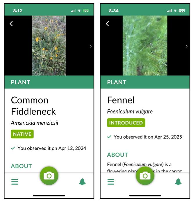 In the examples using SEEK, one can learn that the fiddleneck, which is commonly seen, is a native. While fennel, which is also commonly seen at Lake Calavera, was introduced (and has become invasive in many areas).