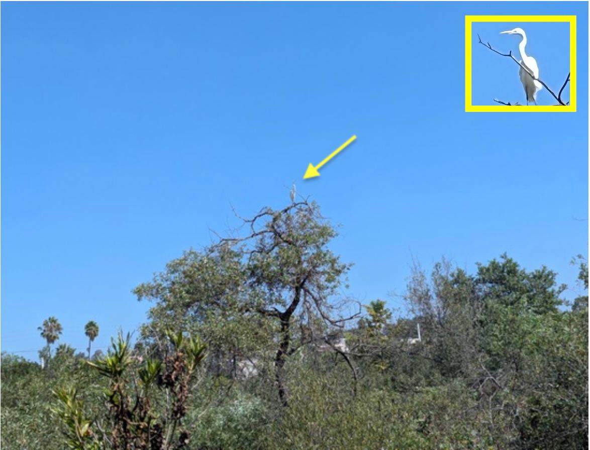 | | Below left, Vince Rivas (SDHC Conservation Habitat Manager) tagging invasive castor bean for removal. At right Justin Gamble (City of Oceanside, Sustainability Program Administrator) deftly wielding a machete to remove the castor bean plant. | | As we were wrapping up the clean up, we noticed a great egret perching atop a willow tree along the creek. Cleaning up the creek is not just for the humans but for all of the wildlife that calls El Salto Falls home. The planet belongs to all creatures great and small so let's work at keeping it clean. Photo by GT Wharton. | | | | |