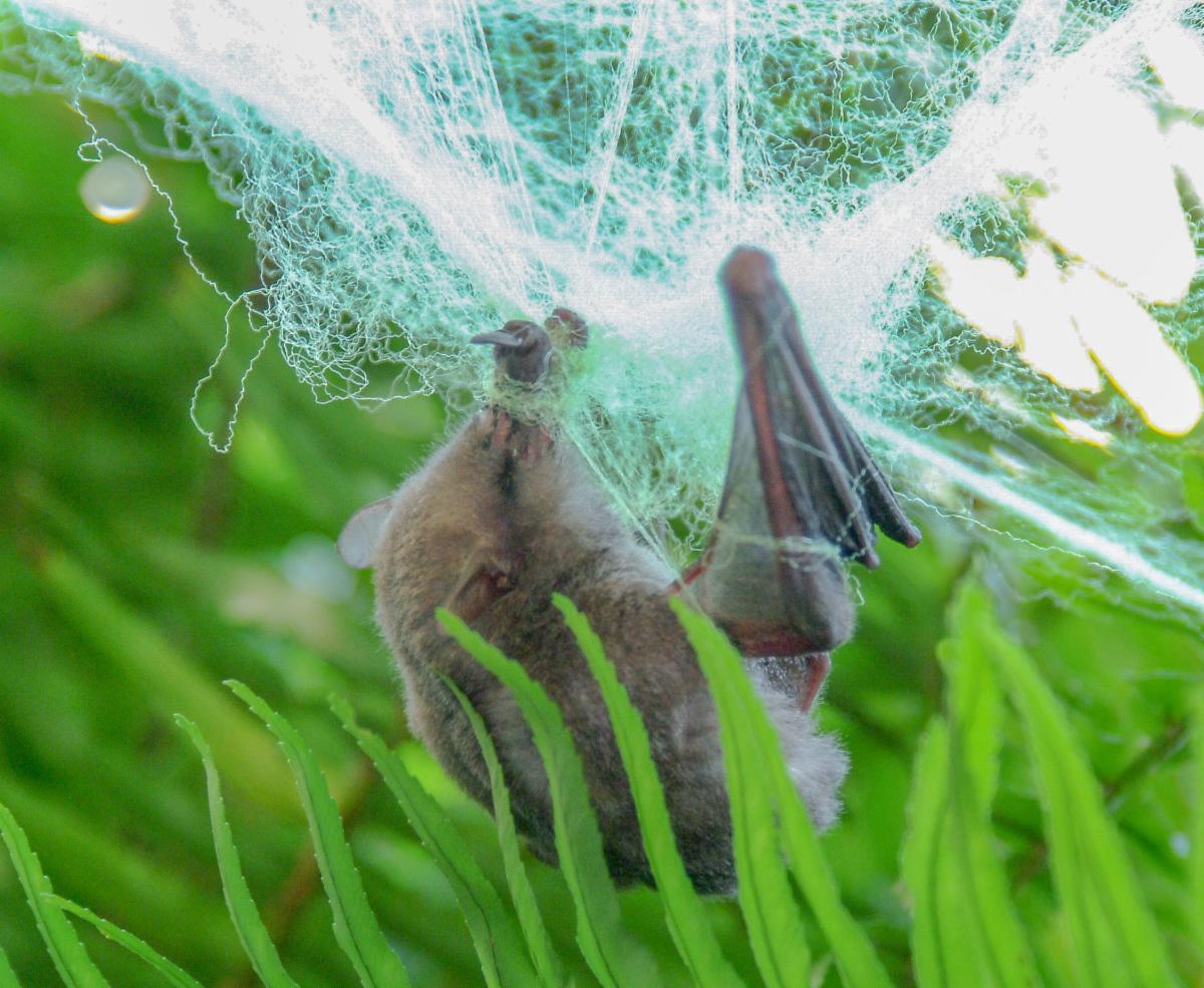 Please don’t use fake cobwebs outdoors for Halloween décor. It can entangle bats and birds and all kinds of other small victims, such as this Mexican Long-tongued bat. He was rescued and released, lucky to be unharmed by his ordeal. (photo credit Dick Wilkins)