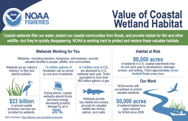 | | With fewer federal protections, this could open up wetlands to more development and more pollution. At stake in California are seasonal streams, ponds and vernal pools, which are only saturated with water part of the time. This would exclude them from wetlands designation under the Supreme Court ruling since they are not continuous. In California, an estimated 80% of all linear miles of streams and rivers are ephemeral or intermittent. And already at risk vernal pools (read more April 2025) would lose vital protections. California will ensure that these waters of the state will continue to be protected even if protections for federal waters are narrowed by administrative actions or the courts. | | Although it is estimated that wetlands only make up 4-6% of earth’s land surface, they are among the world’s most productive and biologically diverse environments—rivaling rainforests. | | The outsized role of wetlands in maintaining healthy ecosystems is often compared to the job our kidneys do for our bodies; filtering and remove pollutants. Wetlands do this by slowing down water as it travels through the watershed. This allows suspended materials in the water to settle out so pollutants are trapped before reaching the ocean. Some of the pollutants are absorbed within soil layers and some taken up by plants. Soils and plants are able to break down many of the pollutants over time using their biological processes. | | Imagine wetlands acting as the kidneys in your body and helping to purify our environment. Illustration credit University of Florida. | | The graphic below from the National Oceanic and Atmospheric Administration describes the value of Coastal Welland Habitat. | | |