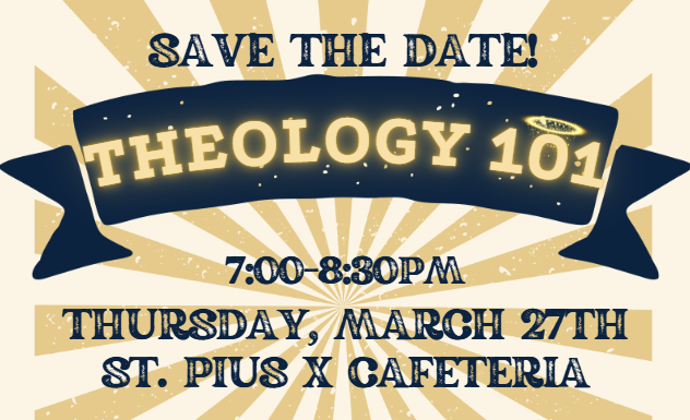 Mark your calendars for Thursday, March 27, and don’t miss the last Theology 101 session of the year, hosted by the St. Pius X Theology Department. This adults-only evening offers a fun and welcoming introduction to theological topics in the company of fellow Pius adults—think of it as a mini intro theology course just for you!