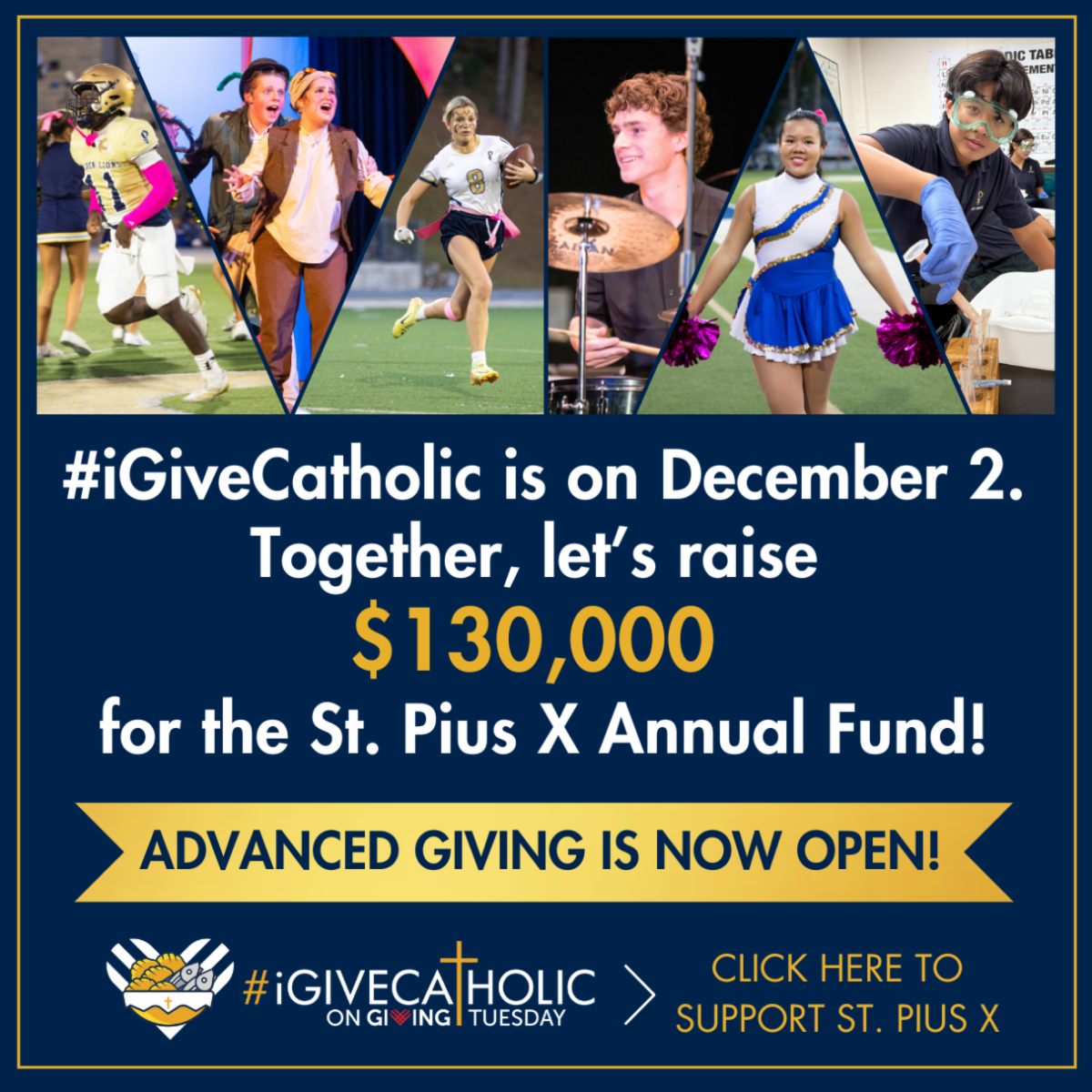 One meaningful way to support these students is through our #iGiveCatholic campaign. We aim to raise $130,000 for our Annual Fund — 10% of our total goal. Early giving has begun, and generous donors have already depleted an initial matching gift of $5,000! The excitement continues on December 1 and 2 with a $50,000 match. This year, we are especially excited about our Alumni Challenge gift — if 200 alumni participate between now and December 2, our Alumni Advisory Board will contribute $30,000! Your donation — at any level-helps us secure these special incentives and directly strengthens the student experience at St. Pius X.
