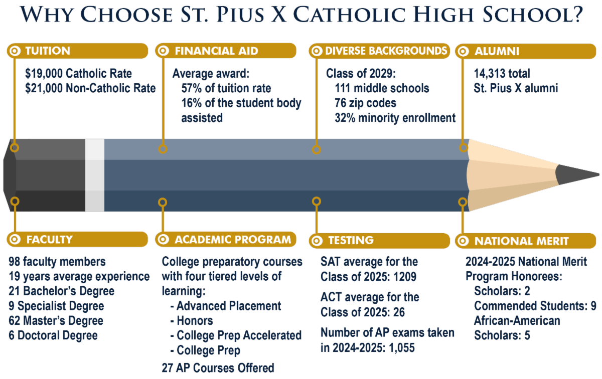 With outstanding academics, championship athletics, vibrant arts, and a safe, welcoming environment, every student is empowered to discover their strengths and reach their highest potential. Here, students make lifelong friends, get involved, and grow into the best version of themselves, inside and outside the classroom. Families choose St. Pius X for its proven success and its commitment to forming young people of purpose and character. It’s an investment in your child’s future — and it truly pays off.