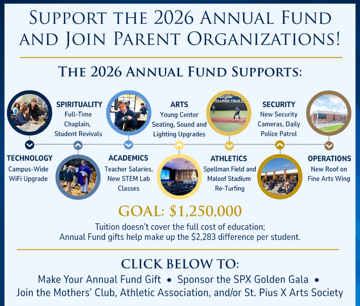 We recently mailed our current families the 2025-2026 Philanthropy Guide, which includes a myriad of ways to get involved and support the school. While this piece is directed toward current parents, I encourage all of our supporters to click here to review it, and then consider how you might share your time, talent, and treasure with St. Pius X. Our school has long been blessed by the generosity of parents, alumni, and friends, and we need your continued partnership to fulfill our mission of providing the best Catholic, college preparatory education to every student who walks through our doors.