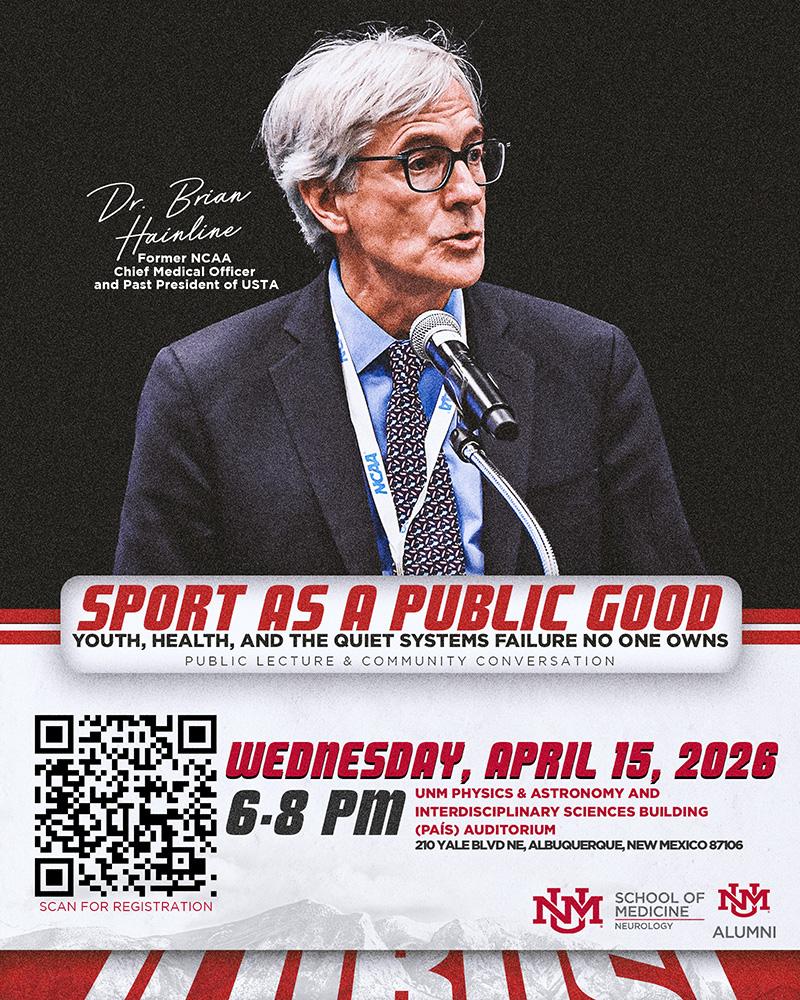 What if youth sports were designed first and foremost for the health and well-being of children? That question will be at the center of a special community lecture hosted by the University of New Mexico Department of Neurology on April 15 from 6–8 p.m. at the PAÍS Auditorium. Renowned neurologist and sports-medicine leader Brian Hainline—the former chief medical officer of the NCAA—will explore how youth sports in the United States have drifted from their original purpose and how they might be reimagined to better support lifelong health, inclusion, and human development. The free lecture will conclude with an informal community conversation and refreshments.