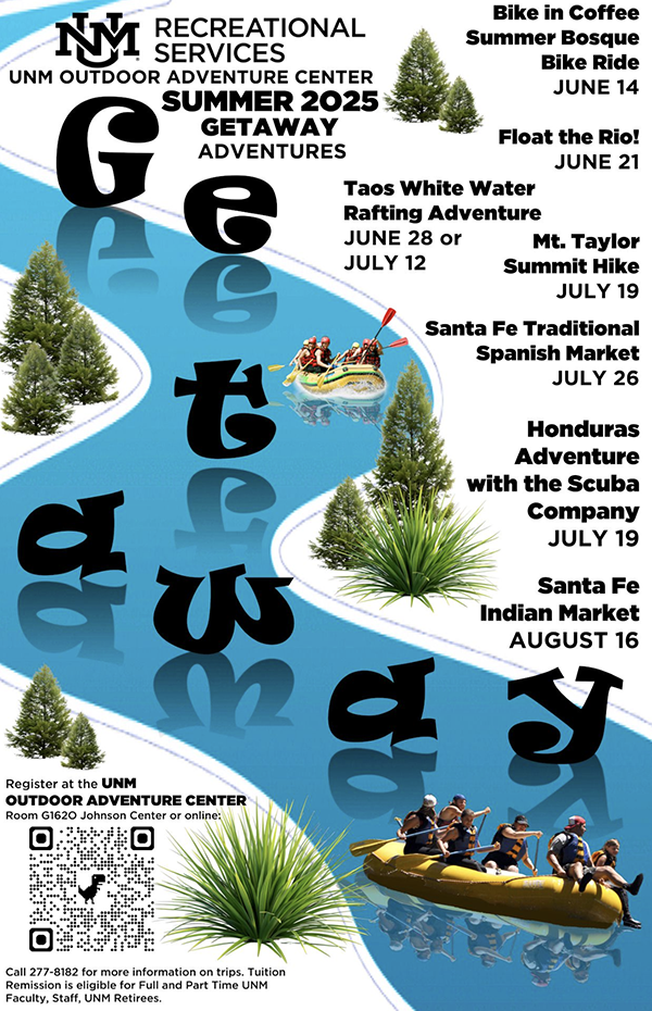Perhaps you might consider exploring any of New Mexico’s 35 state parks or 19 national parks, monuments, and historic trails. Or maybe visit Johnson Center Aquatics on our Albuquerque campus, where your Lobo card provides access to a full-size Olympic swimming pool, a lap pool, and plenty of other activities. You’ll also find lots of fun opportunities and adventures available from UNM’s Recreational Services, including Getaway Adventures for white water rafting in Taos and SCUBA certification classes. Recreational Services also provides a number of adaptive programs and events to ensure its services are available to as many as possible.