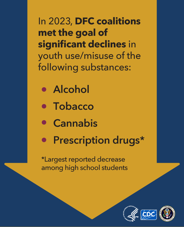 The DFC program is aimed at mobilizing community leaders to identify and respond to the drug problems unique to their community and change local community environmental conditions tied to substance use. More than 750 community coalitions across the country receive funding up to $125,000 per year to strengthen collaboration among local partners and create an infrastructure that reduces youth substance use.