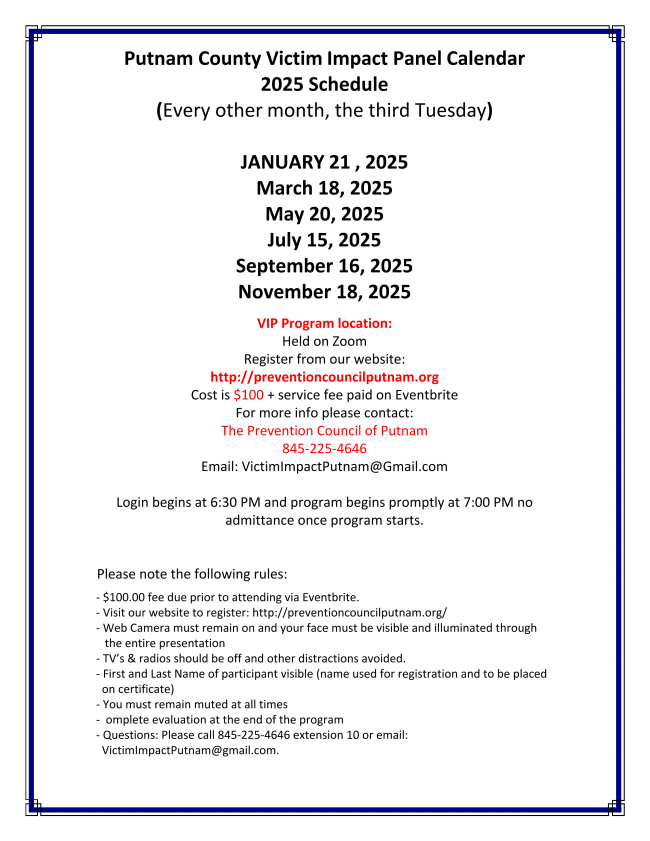 The Putnam County Victim Impact Panel (VIP) Program is a collaboration between The Prevention Council of Putnam, Putnam County Probation Department and Putnam County STOP DWI. The program provides bi-monthly forums on the consequences of drunk driving from people whose lives have been impacted by a drunk driver. Other panel members include people in