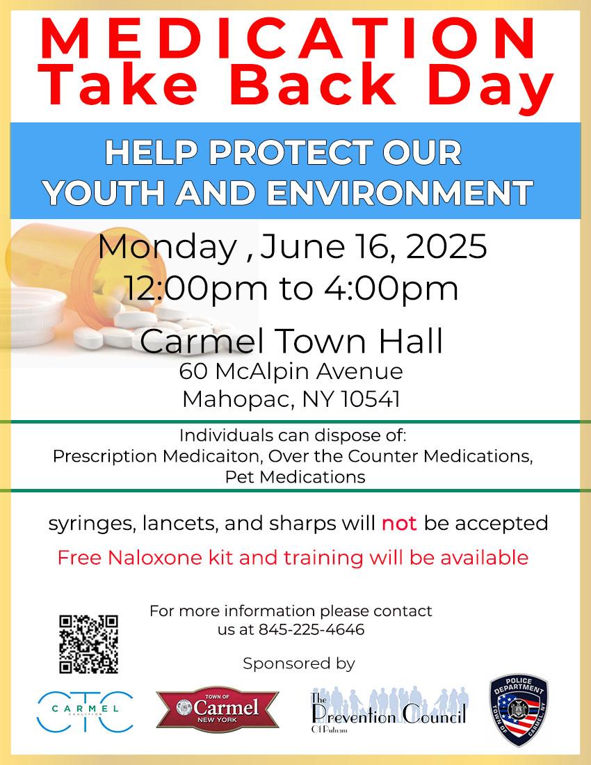 On June 16, we joined forces with the Carmel Police Department, the Town of Carmel, and Nuvance/Northwell Health for a successful Medication Take Back event. In just a few hours, we welcomed over 28 residents who safely disposed of unused medications, an encouraging turnout that reflects our community’s commitment to health and safety. Participants also received Deterra bags for at-home disposal and naloxone kits, empowering them with resources to prevent misuse and respond to opioid overdoses.