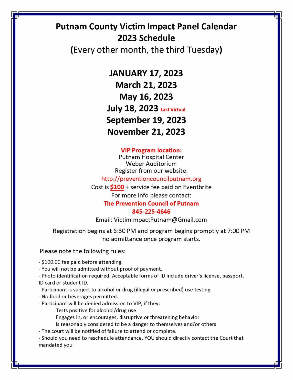 The Putnam County Victim Impact Panel (VIP) Program is a collaboration between The Prevention Council of Putnam, Putnam County Probation Department and Putnam County STOP DWI. The program provides bi-monthly forums on the consequences of drunk driving from people whose lives have been impacted by a drunk driver. Other panel members include people in