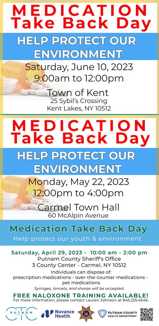 The Putnam Communities That Care Coalition, the Putnam County Department of Health, Putnam Hospital Center, Poison Control Center, Putnam County Sheriff’s Department, Kent Police Department, Carmel Police Department, Carmel Town Hall and community volunteers, joined forces to facilitate Medication Take Back Days in the towns of Carmel and Kent. On April 29, 2023, it was held at the Putnam County Sheriff’s Department in Carmel, where we collected 234 pounds of medication and 175 pounds of sharps. On May 22, 2023, it was held at the Carmel Police Department / Town hall in Carmel, NY. We collected 80 pounds of medication and sharps. On June 10, 2023, it was held at the Kent Police Station/ Town hall and we collected 100 pounds of medication and sharps. In addition to the collection of medication and sharps, Deterra Drug Deactivation kits and Naloxone kits were made available. Naloxone training was also made available at each site. We appreciate all the support from our Community Partners that helped facilitate the smooth running of all these events.