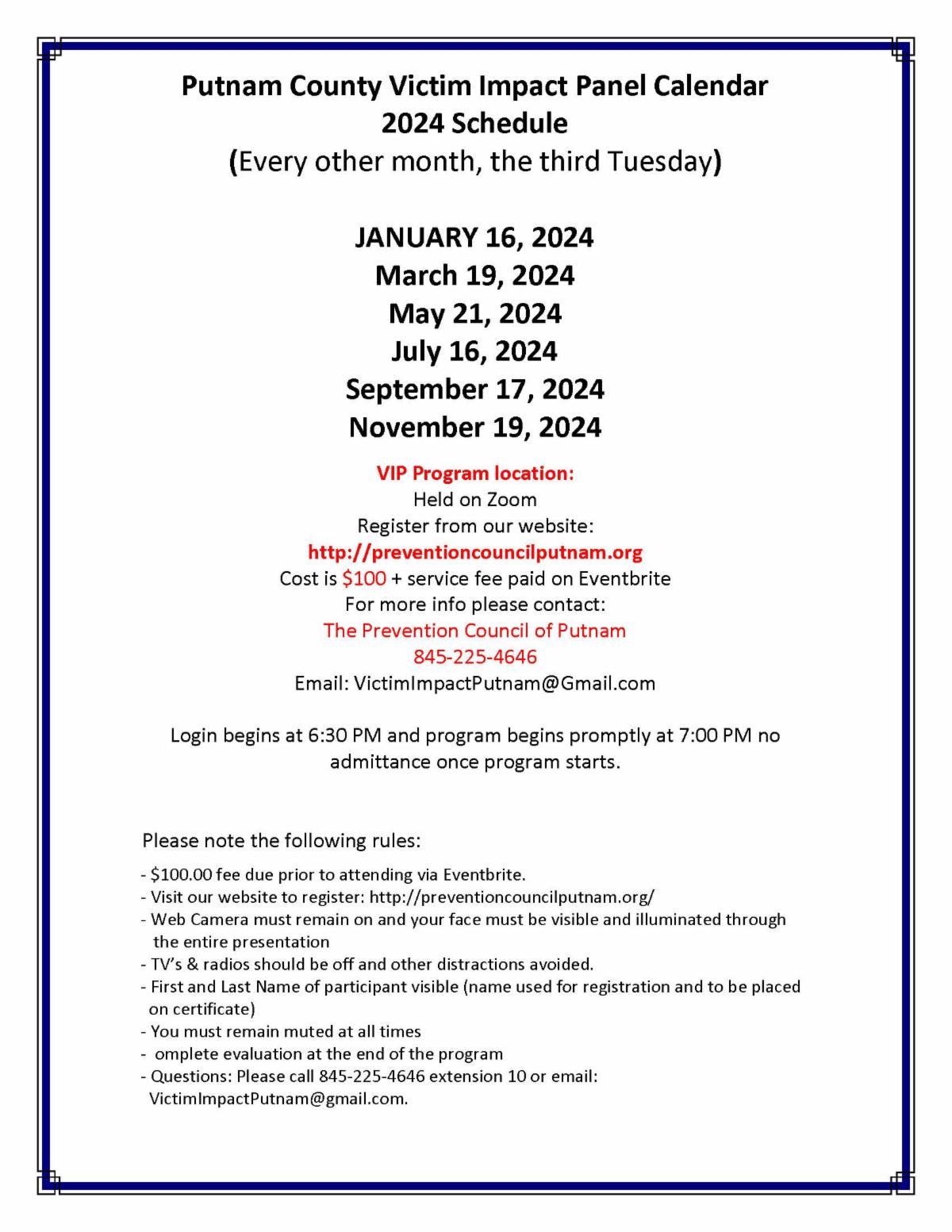 The Putnam County Victim Impact Panel (VIP) Program is a collaboration between The Prevention Council of Putnam, Putnam County Probation Department and Putnam County STOP DWI. The program provides bi-monthly forums on the consequences of drunk driving from people whose lives have been impacted by a drunk driver. Other panel members include people in