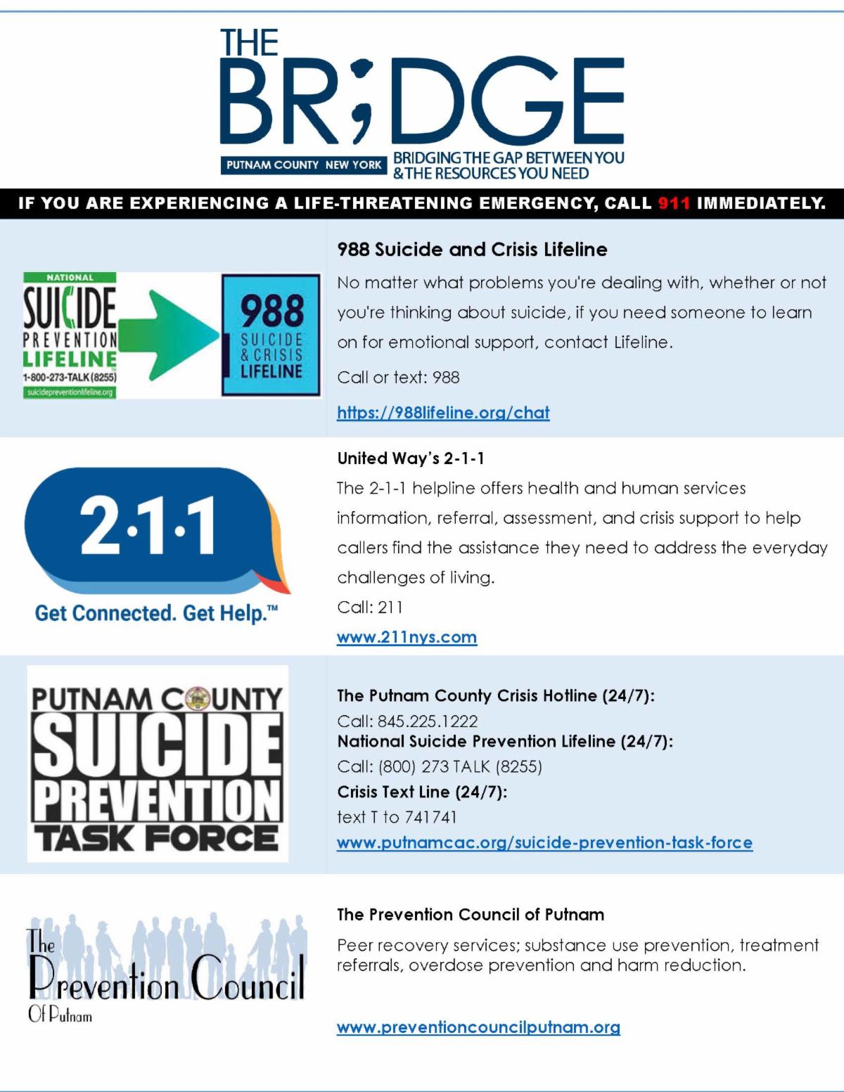 In 2023, the BRIDGE Alliance was formed. The alliance is working to bridge the gap between consumers and community resources to prevent overdose-related risk factors and negative health outcomes through collaborative data collection, education and intervention at both the individual and community level. Membership includes the Putnam County Coroner’s Office, Putnam County Department of Health, Putnam County Emergency Medical Services, Putnam County Departments of Mental Health and Social Services, Prevention Council of Putnam, Putnam County Sheriff’s Office, Carmel Police Department, Kent Police Department and the High-Intensity Drug Trafficking Area.