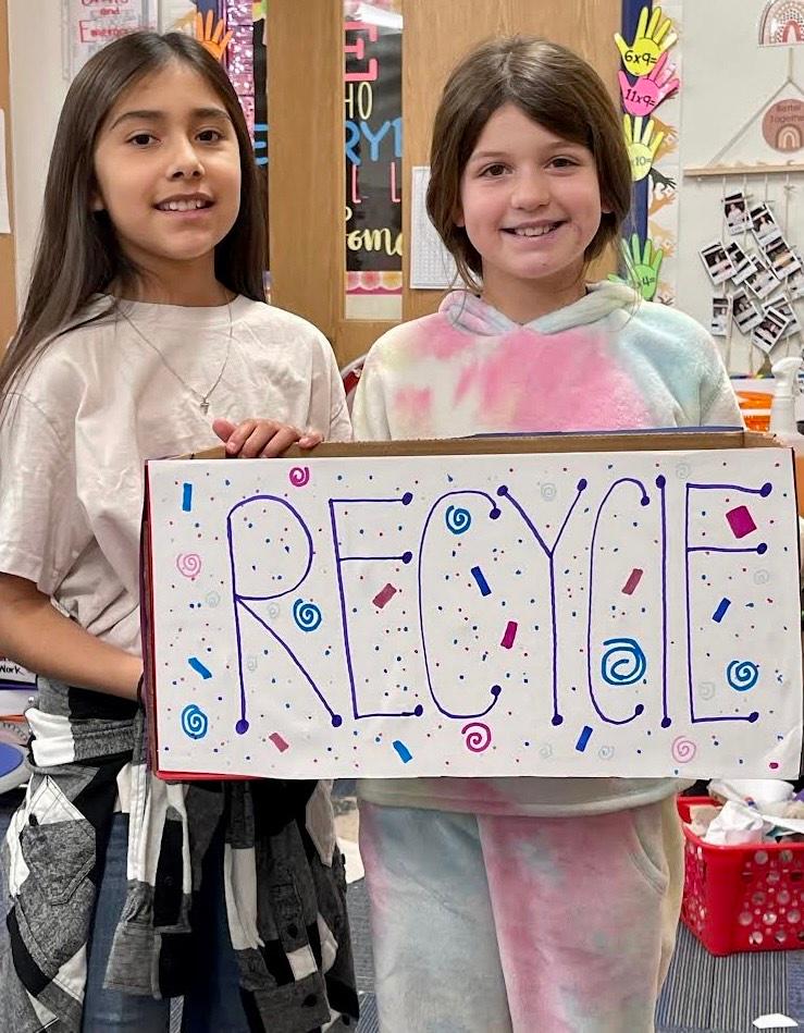Lowe started a recycling project, and Paula Bodie and Lauren Whitehead’s 4th-grade students can earn rewards by creating recycling bins for teachers, including Valeria Nieto and Natalie Evans. This is one of the many bins they are creating. They are also starting a GreenTeam to gather recycling from teachers each week.