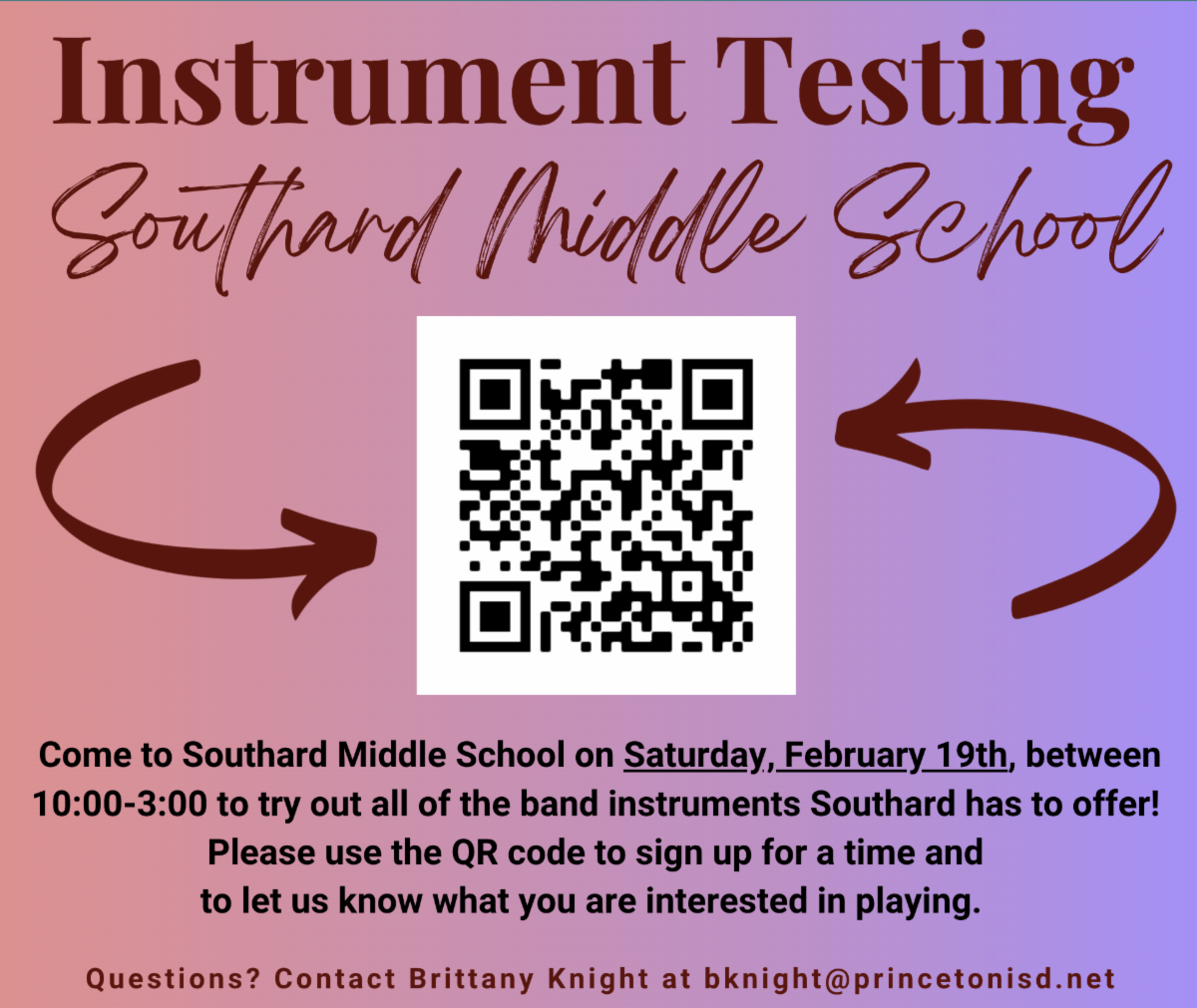 Southard band instrument testing has been rescheduled for Saturday, Feb. 19, from 9 a.m.-3 p.m. at Southard.