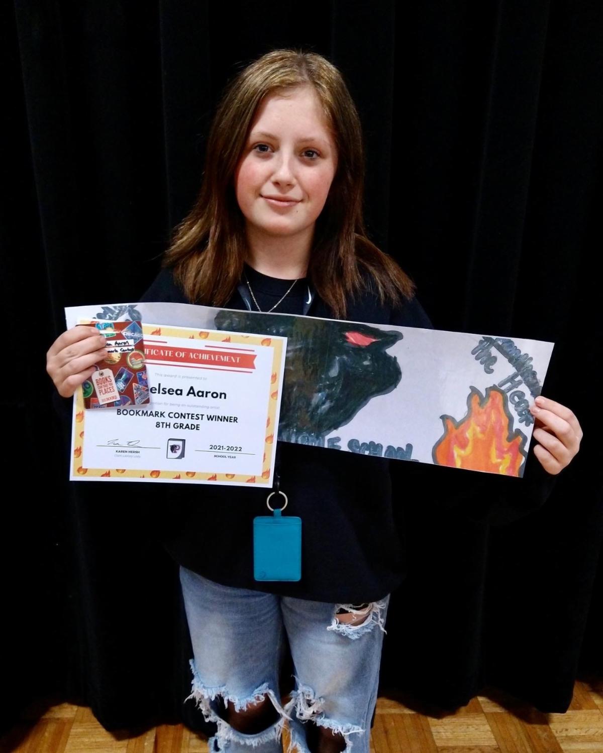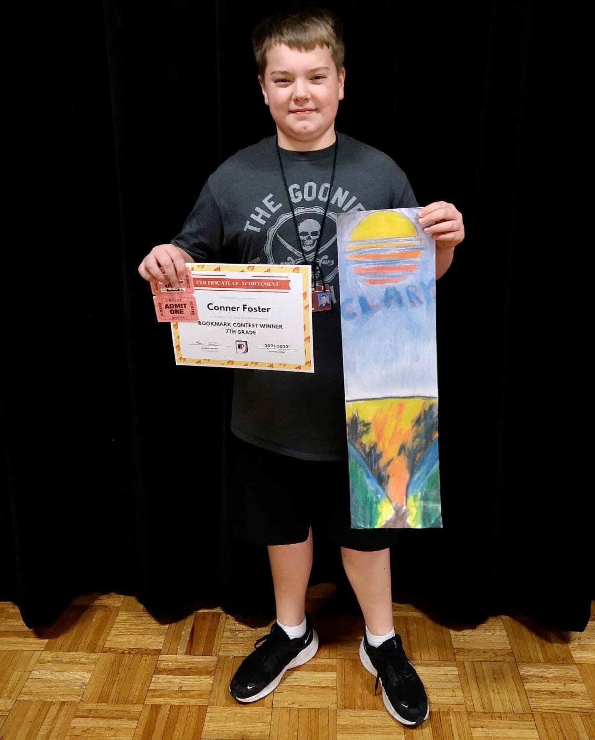 The Clark bookmark contest winners are Joshua Dean, 6th; Conner Foster, 7th; and Chelsea Aaron, 8th. Winners received a laminated poster of their bookmark design, a $25 Half Price Books gift card and 10 copies of their bookmark to give to family and friends. All Clark students will receive a bookmark of their grade level's winning design.