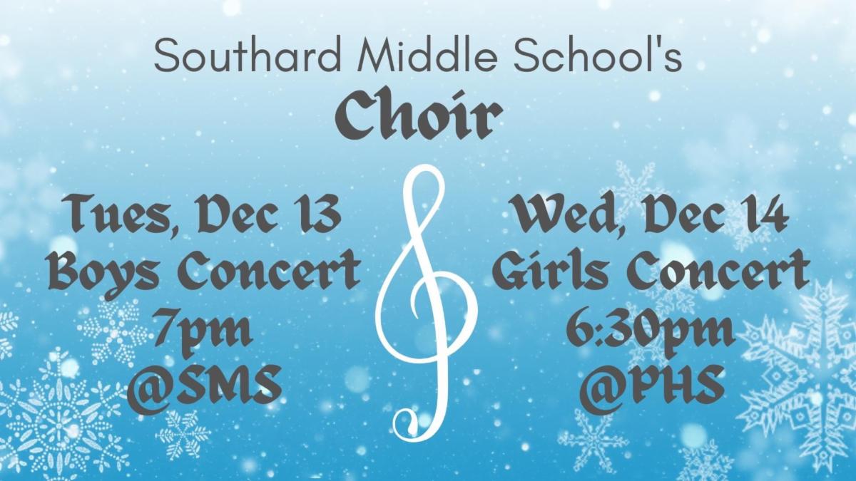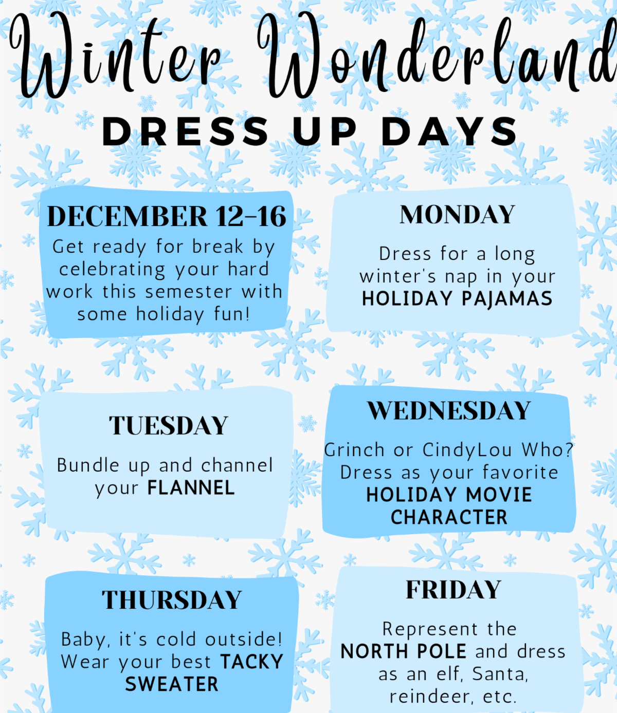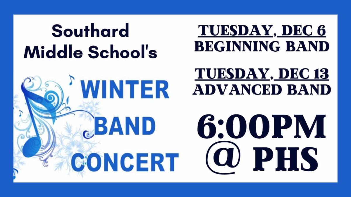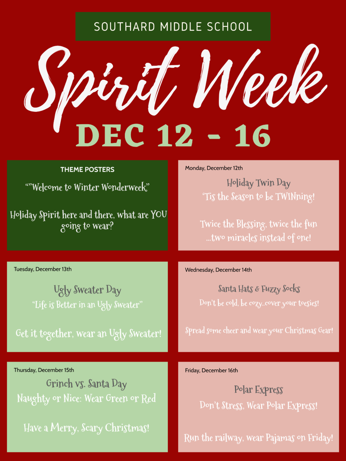 Southard's Winter Wonderland Dance, originally scheduled for Dec. 9, has been moved to Jan. 13. Attire is semi-formal (within dress code), Requirements for attending: No time in ISS during the 3rd six weeks and must pass all classes during the 3rd six weeks. Cost is $5, and students can buy a ticket from teachers Felicia Nichols or Corrie Reigle or online at https://www.vancoevents.com/BOBF