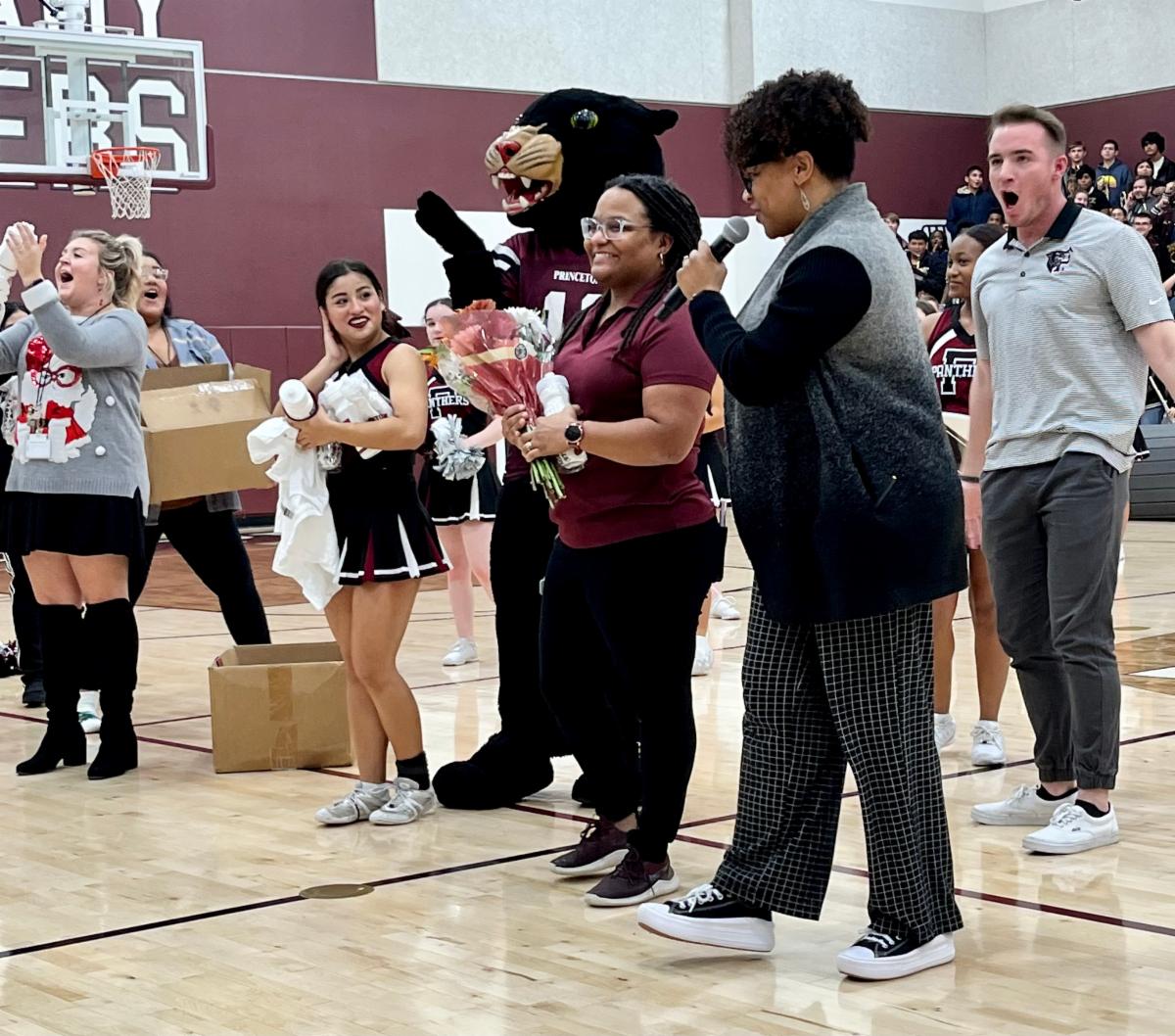Pete the Panther was searching for Panther spirit during the pep rally at Lovelady and found it in the student section, as well as with biology teacher Arionne Smith, who was named the campus Teacher of the Year.