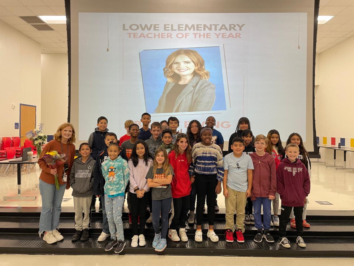 Principal Jeff Coburn, Assistant Principal Amy Larson and the entire 5th-grade class gathered to surprise 5th-grade lead teacher Bailey Ewing on being named the Lowe Elementary Pride Corps Teacher of the Year.