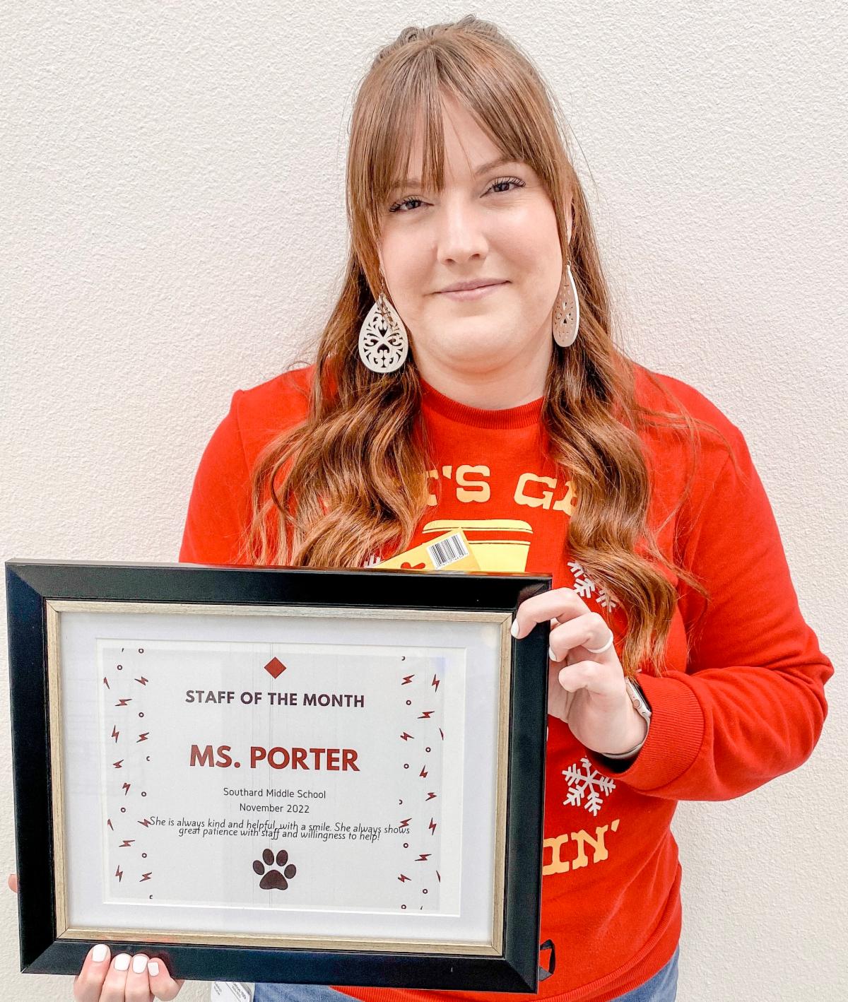 Southard Middle School recognized its Staff Member of the Month, registrar Katelyn Porter, for always showing patience with staff and willingness to help.