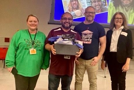 Godwin Principal Misti Chapman and Assistant Principal Maygan Wall congratulate 2nd- and 3rd-grade bilingual teacher Sally Figueroa on being named the Godwin Elementary teacher of the year.