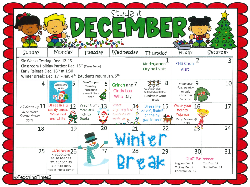Princeton ISD schools and offices will be closed Dec. 19-Jan. 2 for Christmas break. Teachers return for staff development and a work day Tuesday, Jan. 3. Students return for classes Thursday, Jan. 5.