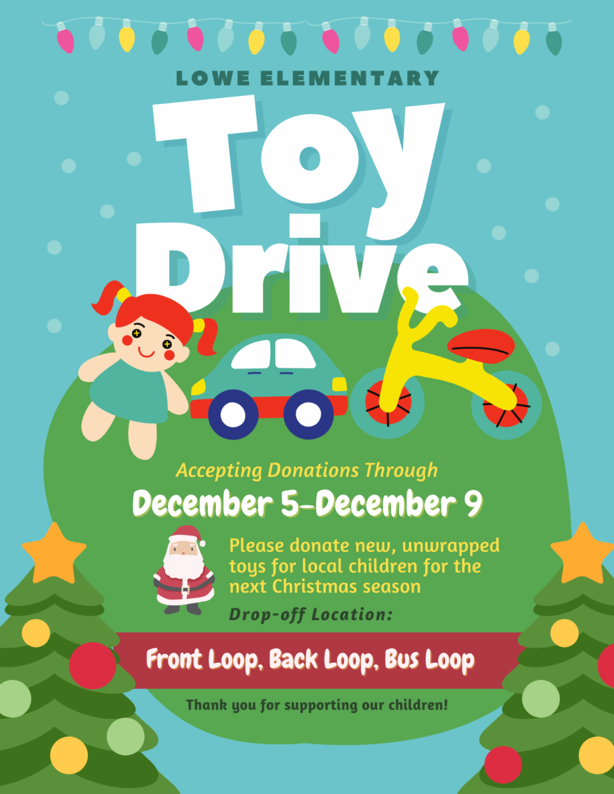 The Lowe Service Leaders are in the middle of their 2nd Annual Toy Drive to benefit local children. The toy drive ends Dec. 9. Toy drop off takes place in the mornings in the front loop, bus loop and back loop.