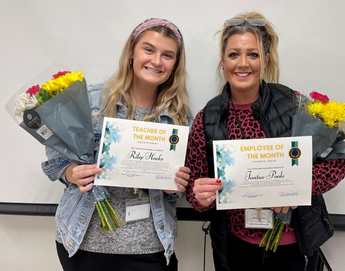 November Staff Members of the Month for Godwin are teacher Riley Hooks and office professional Jontue Poole.