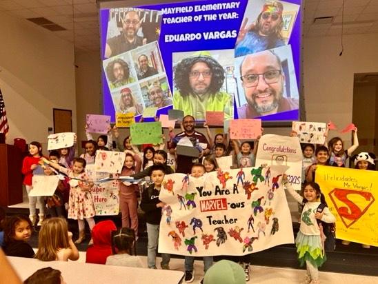 Kindergarten teacher Eduardo Vargas has been selected as Mayfield Elementary Teacher of the Year. K-2 students were gathered to "discuss" cafeteria procedures, but it was all a ruse. Mr. Vargas was joined by his wife and daughter, as well as Mayfield's namesake, Mary Mayfield.