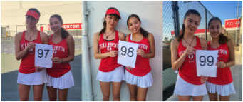 Doubles #2 Nicole White and Bonnie Lynch (6-1, 2-6, 6-0) and #3 doubles Francine Bondoc and Amber Elomina (6-1, 0-6, 6-2) contributed 4 points to the team. #1 doubles Rebecca Balarie and Christina Sfatcu (6-0, 6-1, 6-1) won all three of their sets played, bringing their total two year wins to 99. They will break the 100 mark next Monday against La Habra HS. Such an amazing feat!