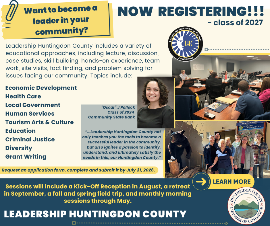 Are you ready to grow as a leader and make a meaningful impact in our community? Leadership Huntingdon County is now accepting applications for the Class of 2027, and we’re seeking individuals who are passionate about making a difference right here at home.