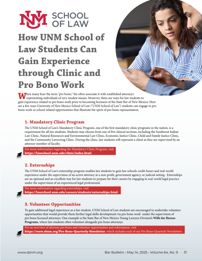 When many hear the term "pro bono," the often associate it with established attorneys representing individuals of very modest means. However, there are ways for law students to gain experience related to pro bono work prior to becoming licensees of the State Bar of New Mexico. Here are a few ways University of New Mexico School of Law ("UNM School of Law") students can engage in pro