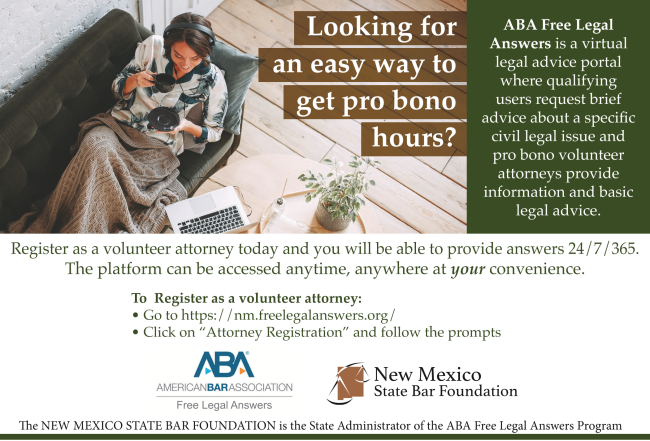ABA Free Legal Answers is a virtual legal advice portal where qualifying users request brief advice about a specific civil legal issue and pro bono volunteer attorneys provide information and basic legal advice.