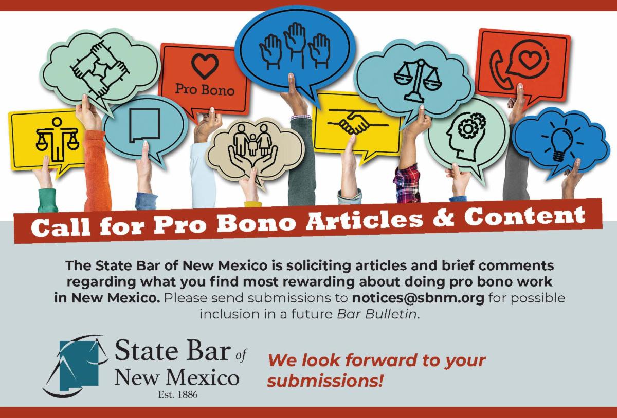 The State Bar of New Mexico is soliciting articles and brief comments regarding what you find most rewarding about doing pro bono work in New Mexico. Please send submissions to notices@sbnm.org for possible inclusion in a future Bar Bulletin.