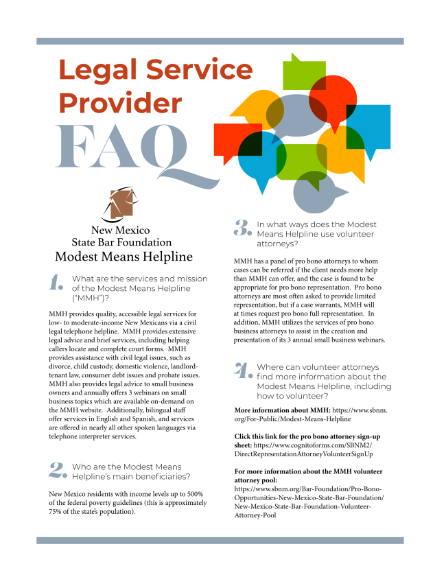 The New Mexico State Bar Foundation’s Modest Means Helpline is currently open for callers in need of legal support and assistance. Serving New Mexicans with incomes below 500% of the federal poverty guidelines, the Modest Means Helpline is committed to the underrepresented in New Mexico. New Mexican residents can reach the Modest Means Helpline at 505-797-6013 or 888-857-9935.