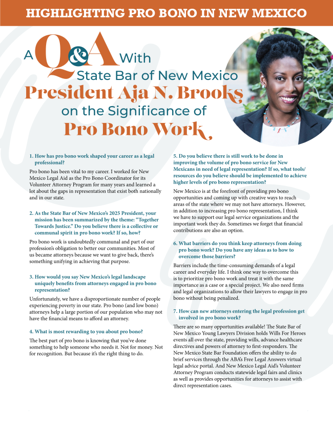 State Bar of New Mexico President Aja N. Brooks shares how pro bono work has not only shaped her legal career but continues to unify the profession in the fight for access to justice. From addressing statewide gaps in legal representation to empowering new attorneys through hands-on service opportunities, her message is clear: pro bono work is a vital, unifying force for good. Read more about her perspective on pro bono work in her Q&A.