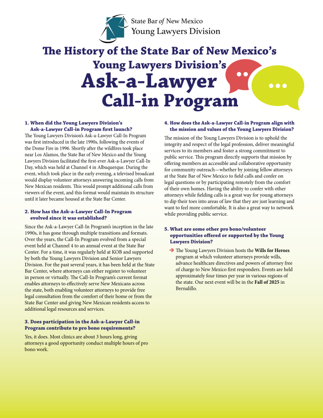 The Young Lawyers Division of the State Bar of New Mexico launched its Ask-a-Lawyer Call-In Program in the late 1990s to provide free legal advice to the public, originally in response to the Dome Fire. The program has since evolved into an annual event with both in-person and virtual volunteer opportunities, helping expand access to legal services statewide. It continues to support pro bono work while offering young attorneys meaningful public service and professional development.