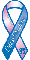 Huge Price Reduction! Use the new trend to add a ribbon to your car as a great way to show your support of life. The ribbon is blue and pink for the baby boys and girls affected by abortion and is made of entirely magnetic material. The message "Life is Precious" is emblazoned across the ribbon with the baby's foot prints adorning the bottom. Image is screen printed directly onto the magnet with UV resistant ink for long lasting color and appearance. It will last for many years. Size is 4" x 8".