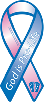 New Design! Use the new trend to add a ribbon to your car as a great way to show your support of life. The ribbon is blue and pink for the baby boys and girls affected by abortion and is made of entirely magnetic material. The message "God is Pro-Life" is emblazoned across the ribbon with the baby's foot prints adorning the bottom. Image is screen printed directly onto the magnet with UV resistant ink for long lasting color and appearance. It will last for many years. Size is 4" x 8".