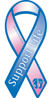 Huge Price Reduction! Use the new trend to add a ribbon to your car as a great way to show your support of life. The ribbon is blue and pink for the baby boys and girls affected by abortion and is made of entirely magnetic material. The message "Support Life" is emblazoned across the ribbon with the baby's foot prints adorning the bottom. Image is screen printed directly onto the magnet with UV resistant ink for long lasting color and appearance. It will last for many years. Size is 4" x 8".