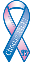 Huge Price Reduction! Use the new trend to add a ribbon to your car as a great way to show your support of life. The ribbon is blue and pink for the baby boys and girls affected by abortion and is made of entirely magnetic material. The message "Choose Life" is emblazoned across the ribbon with the baby's foot prints adorning the bottom. Image is screen printed directly onto the magnet with UV resistant ink for long lasting color and appearance. It will last for many years. Size is 4" x 8".