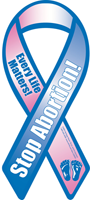 Huge Price Reduction! Use the new trend to add a ribbon to your car as a great way to show your support of life. The ribbon is blue and pink for the baby boys and girls affected by abortion and is made of entirely magnetic material. The message "Stop Abortion" is emblazoned across the ribbon with the baby's foot prints adorning the bottom. Image is screen printed directly onto the magnet with UV resistant ink for long lasting color and appearance. It will last for many years. Size is 4" x 8".